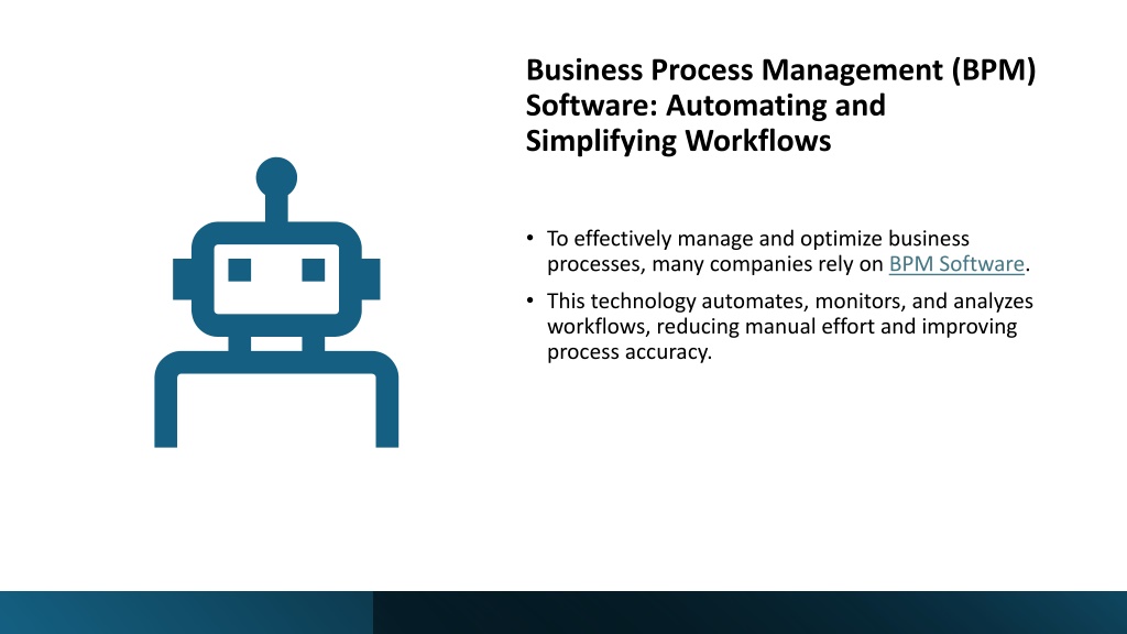 Business Process Management (BPM) Software: Automating and Simplifying Workflows • To effectively manage and optimize business processes, many companies rely on BPM Software. • This technology automates, monitors, and analyzes workflows, reducing manual effort and improving process accuracy.