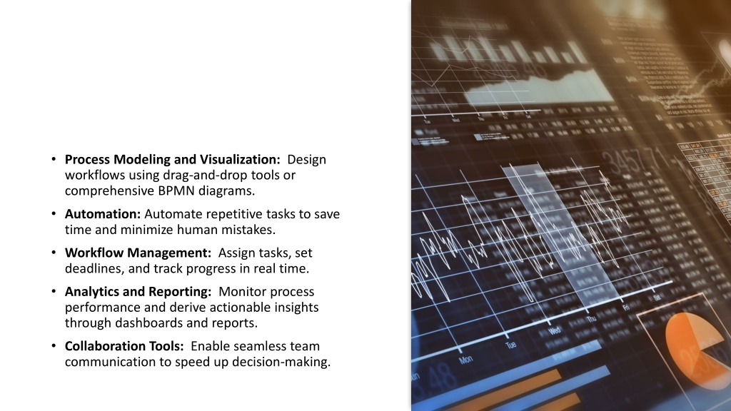 Process Modeling and Visualization: Design workflows using drag-and-drop tools or comprehensive BPMN diagrams. • Automation: Automate repetitive tasks to save time and minimize human mistakes. • Workflow Management: Assign tasks, set deadlines, and track progress in real time. • Analytics and Reporting: Monitor process performance and derive actionable insights through dashboards and reports. • Collaboration Tools: Enable seamless team communication to speed up decision-making.