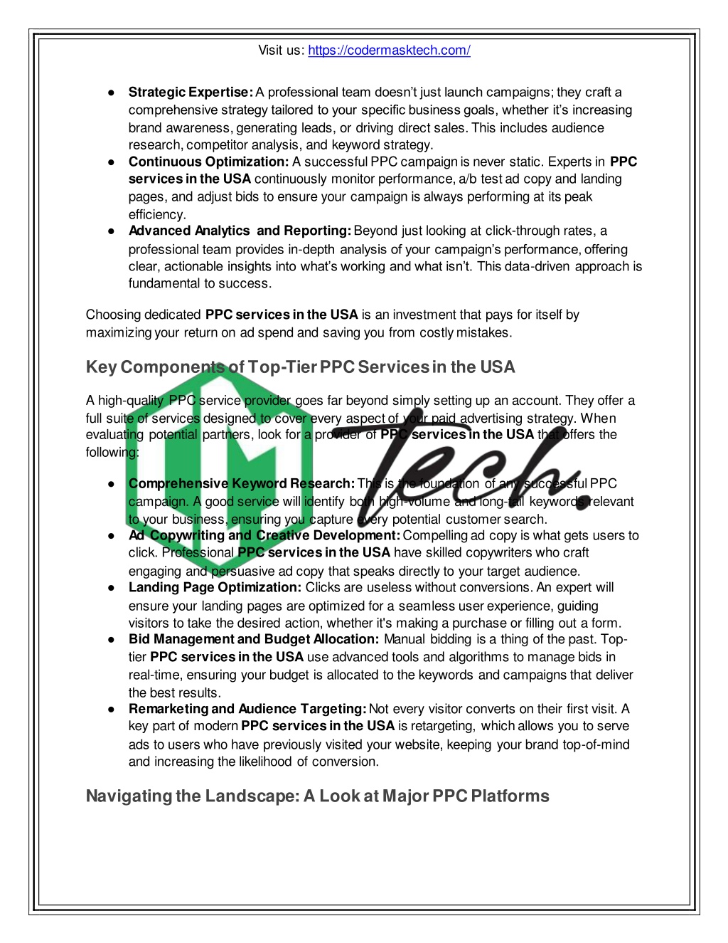 Visit us: https://codermasktech.com/ ●Strategic Expertise:A professional team doesn’t just launch campaigns; they craft a comprehensive strategy tailored to your specific business goals, whether it’s increasing brand awareness, generating leads, or driving direct sales. This includes audience research, competitor analysis, and keyword strategy. ●Continuous Optimization: A successful PPC campaign is never static. Experts in PPC services in the USA continuously monitor performance, a/b test ad copy and landing pages, and adjust bids to ensure your campaign is always performing at its peak efficiency. ●Advanced Analytics and Reporting: Beyond just looking at click-through rates, a professional team provides in-depth analysis of your campaign’s performance, offering clear, actionable insights into what’s working and what isn’t. This data-driven approach is fundamental to success. Choosing dedicated PPC services in the USA is an investment that pays for itself by maximizing your return on ad spend and saving you from costly mistakes. Key Components of Top-Tier PPC Services in the USA A high-quality PPC service provider goes far beyond simply setting up an account. They offer a full suite of services designed to cover every aspect of your paid advertising strategy. When evaluating potential partners, look for a provider of PPC services in the USA that offers the following: ●Comprehensive Keyword Research: This is the foundation of any successful PPC campaign. A good service will identify both high-volume and long-tail keywords relevant to your business, ensuring you capture every potential customer search. ●Ad Copywriting and Creative Development: Compelling ad copy is what gets users to click. Professional PPC services in the USA have skilled copywriters who craft engaging and persuasive ad copy that speaks directly to your target audience. ●Landing Page Optimization: Clicks are useless without conversions. An expert will ensure your landing pages are optimized for a seamless user experience, guiding visitors to take the desired action, whether it's making a purchase or filling out a form. ●Bid Management and Budget Allocation: Manual bidding is a thing of the past. Top- tier PPC services in the USA use advanced tools and algorithms to manage bids in real-time, ensuring your budget is allocated to the keywords and campaigns that deliver the best results. ●Remarketing and Audience Targeting: Not every visitor converts on their first visit. A key part of modern PPC services in the USA is retargeting, which allows you to serve ads to users who have previously visited your website, keeping your brand top-of-mind and increasing the likelihood of conversion. Navigating the Landscape: A Look at Major PPC Platforms