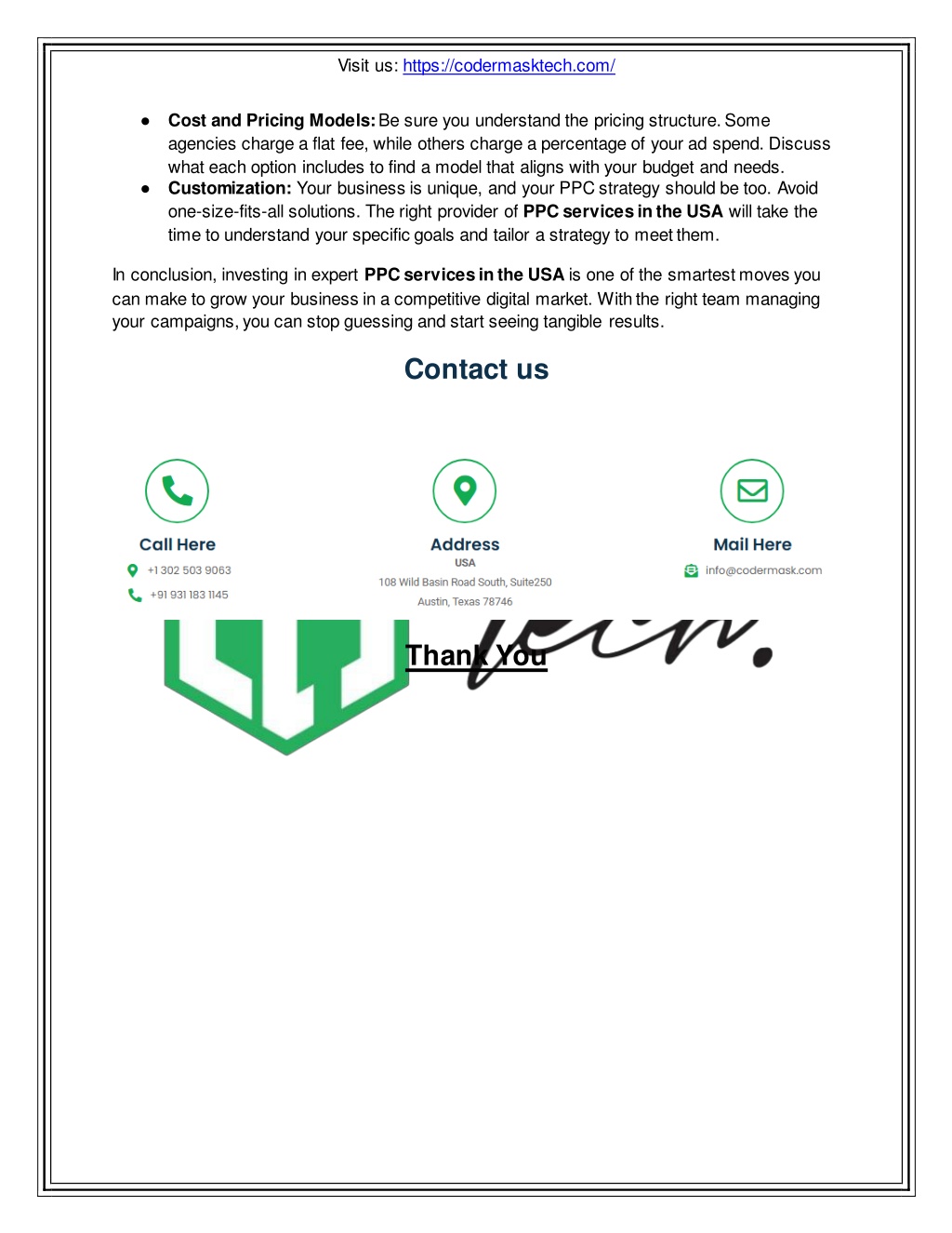 Visit us: https://codermasktech.com/ ●Cost and Pricing Models: Be sure you understand the pricing structure. Some agencies charge a flat fee, while others charge a percentage of your ad spend. Discuss what each option includes to find a model that aligns with your budget and needs. ●Customization: Your business is unique, and your PPC strategy should be too. Avoid one-size-fits-all solutions. The right provider of PPC services in the USA will take the time to understand your specific goals and tailor a strategy to meet them. In conclusion, investing in expert PPC services in the USA is one of the smartest moves you can make to grow your business in a competitive digital market. With the right team managing your campaigns, you can stop guessing and start seeing tangible results. Contact us Thank You