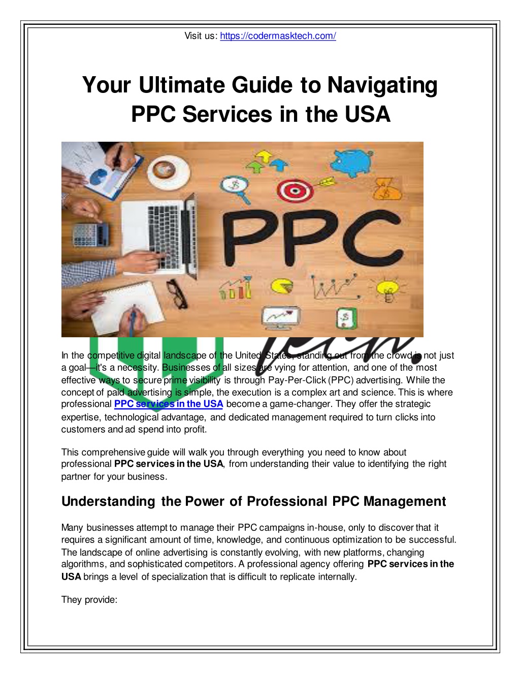 Visit us: https://codermasktech.com/ Your Ultimate Guide to Navigating PPC Services in the USA In the competitive digital landscape of the United States, standing out from the crowd is not just a goal—it's a necessity. Businesses of all sizes are vying for attention, and one of the most effective ways to secure prime visibility is through Pay-Per-Click (PPC) advertising. While the concept of paid advertising is simple, the execution is a complex art and science. This is where professional PPC services in the USA become a game-changer. They offer the strategic expertise, technological advantage, and dedicated management required to turn clicks into customers and ad spend into profit. This comprehensive guide will walk you through everything you need to know about professional PPC services in the USA, from understanding their value to identifying the right partner for your business. Understanding the Power of Professional PPC Management Many businesses attempt to manage their PPC campaigns in-house, only to discover that it requires a significant amount of time, knowledge, and continuous optimization to be successful. The landscape of online advertising is constantly evolving, with new platforms, changing algorithms, and sophisticated competitors. A professional agency offering PPC services in the USA brings a level of specialization that is difficult to replicate internally. They provide: