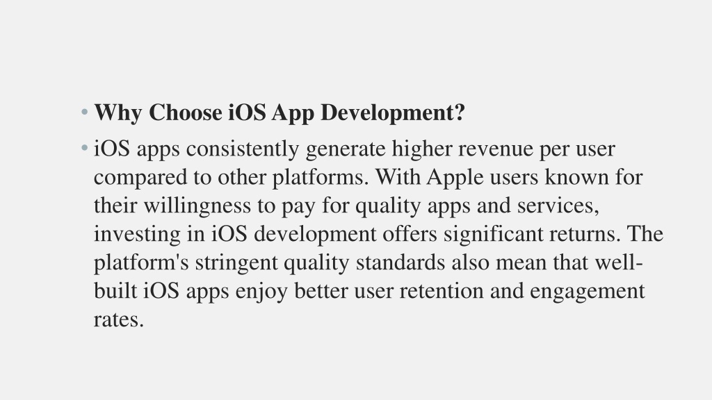 Why Choose iOS App Development? • iOS apps consistently generate higher revenue per user compared to other platforms. With Apple users known for their willingness to pay for quality apps and services, investing in iOS development offers significant returns. The platform's stringent quality standards also mean that well-built iOS apps enjoy better user retention and engagement rates.