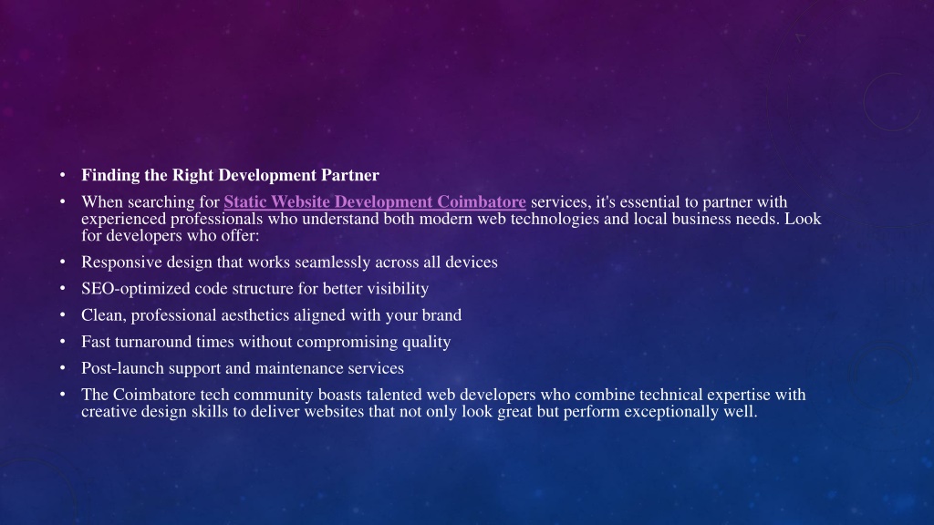 4. Finding the Right Development Partner • When searching for Static Website Development Coimbatore services, it's essential to partner with experienced professionals who understand both modern web technologies and local business needs. Look for developers who offer: • Responsive design that works seamlessly across all devices • SEO-optimized code structure for better visibility • Clean, professional aesthetics aligned with your brand • Fast turnaround times without compromising quality • Post-launch support and maintenance services • The Coimbatore tech community boasts talented web developers who combine technical expertise with creative design skills to deliver websites that not only look great but perform exceptionally well.