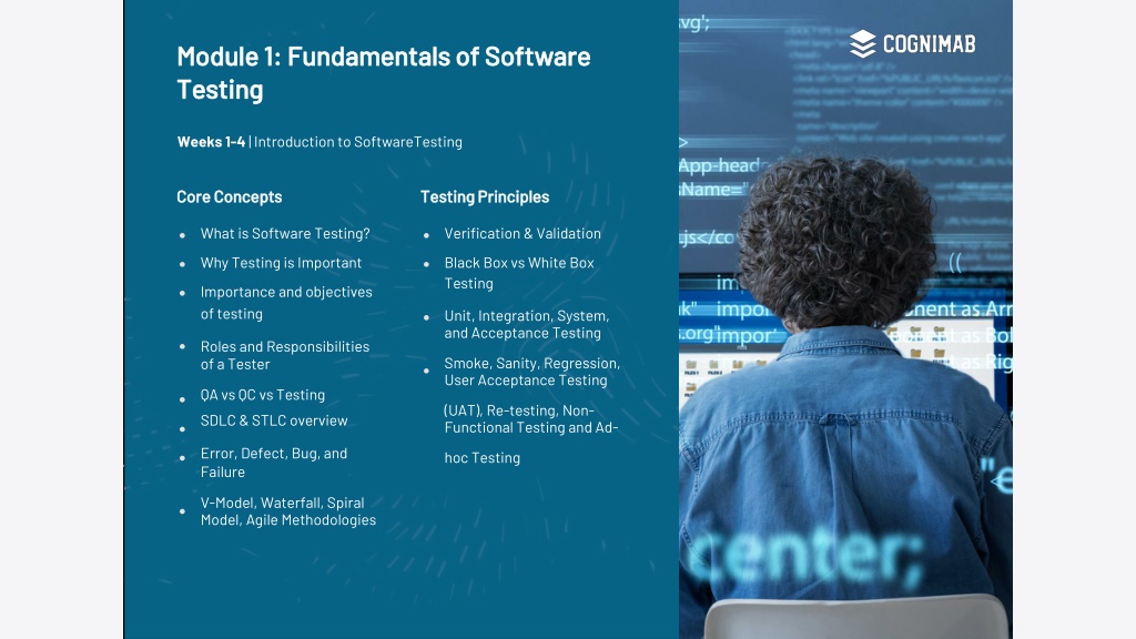 3. Module 1: Fundamentals of Software Testing Weeks 1-4 | Introduction to SoftwareTesting Core Concepts Testing Principles What is Software Testing? Why Testing is Important Importance and objectives of testing Roles and Responsibilities of a Tester QA vs QC vs Testing SDLC & STLC overview Error, Defect, Bug, and Failure V-Model, Waterfall, Spiral Model, Agile Methodologies Verification & Validation Black Box vs White Box Testing Unit, Integration, System, and Acceptance Testing Smoke, Sanity, Regression, User Acceptance Testing (UAT), Re-testing, Non- Functional Testing and Ad- hoc Testing