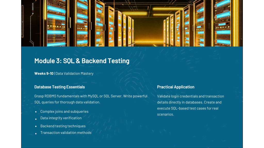 6. Module 3: SQL & Backend Testing Weeks 9-10 | Data Validation Mastery Database Testing Essentials Practical Application Grasp RDBMS fundamentals with MySQL or SQL Server. Write powerful SQL queries for thorough data validation. Validate login credentials and transaction details directly in databases. Create and execute SQL-based test cases for real scenarios. Complex joins and subqueries Data integrity verification Backend testing techniques Transaction validation methods