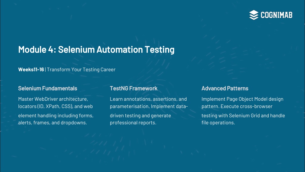 7. Module 4: Selenium Automation Testing Weeks11-16 | Transform Your Testing Career SeleniumFundamentals TestNGFramework AdvancedPatterns Master WebDriver architecture, locators (ID, XPath, CSS), and web element handling including forms, alerts, frames, and dropdowns. Learn annotations, assertions, and parameterisation. Implement data- driven testing and generate professional reports. Implement Page Object Model design pattern. Execute cross-browser testing with Selenium Grid and handle file operations.