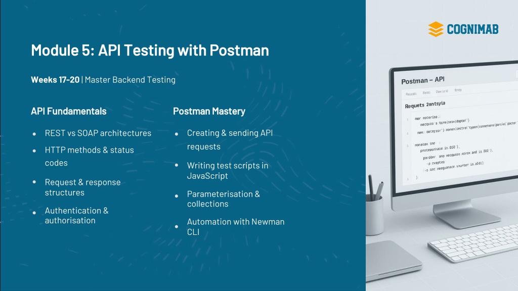 8. Module 5: API Testing with Postman Weeks 17-20 | Master Backend Testing API Fundamentals Postman Mastery REST vs SOAP architectures HTTP methods & status codes Request & response structures Authentication & authorisation Creating & sending API requests Writing test scripts in JavaScript Parameterisation & collections Automation with Newman CLI