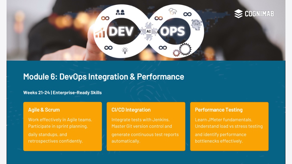 9. Module 6: DevOps Integration & Performance Weeks 21-24 | Enterprise-Ready Skills Agile & Scrum CI/CD Integration Performance Testing Work effectively in Agile teams. Participate in sprint planning, daily standups, and retrospectives confidently. Integrate tests with Jenkins. Master Git version control and generate continuous test reports automatically. Learn JMeter fundamentals. Understand load vs stress testing and identify performance bottlenecks effectively.