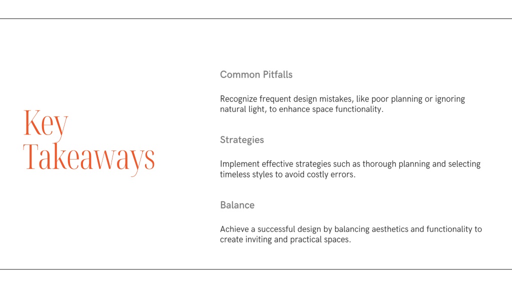 Common Pitfalls • Strategies • Balance • Recognize frequent design mistakes, like poor planning or ignoring natural light, to enhance space functionality. • Implement effective strategies such as thorough planning and selecting timeless styles to avoid costly errors. • Achieve a successful design by balancing aesthetics and functionality to create inviting and practical spaces. • Key Takeaways