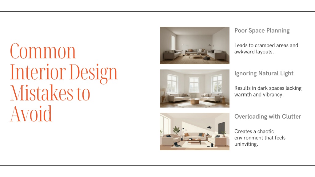 Poor Space Planning • Ignoring Natural Light • Overloading with Clutter • Results in dark spaces lacking warmth and vibrancy. • Creates a chaotic environment that feels uninviting. • Leads to cramped areas and awkward layouts. • Common Interior Design Mistakes to Avoid