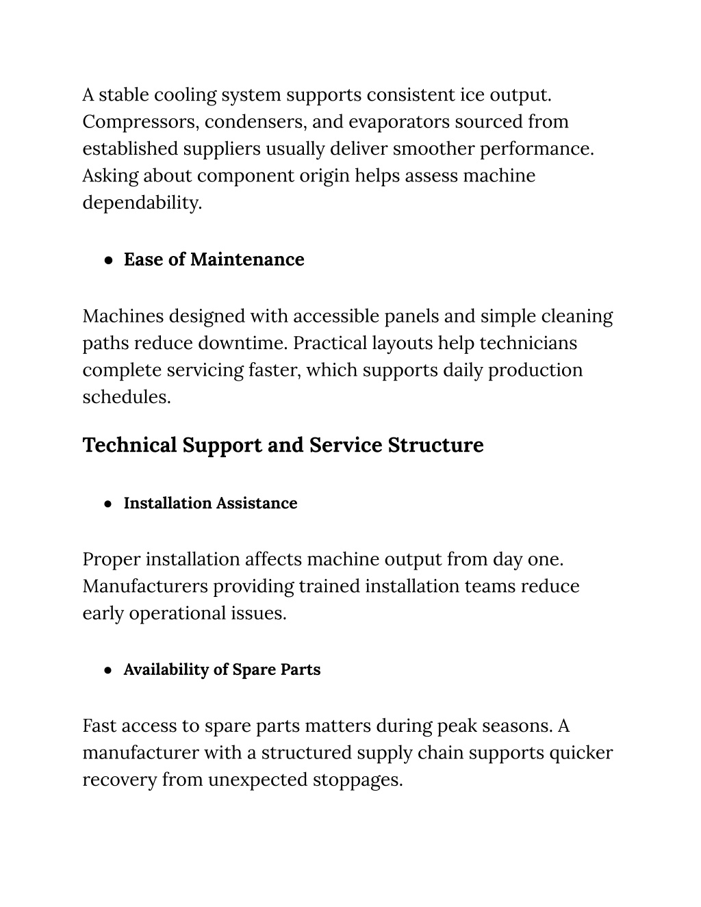 A stable cooling system supports consistent ice output. Compressors, condensers, and evaporators sourced from established suppliers usually deliver smoother performance. Asking about component origin helps assess machine dependability. ● Ease of Maintenance Machines designed with accessible panels and simple cleaning paths reduce downtime. Practical layouts help technicians complete servicing faster, which supports daily production schedules. Technical Support and Service Structure ● Installation Assistance Proper installation affects machine output from day one. Manufacturers providing trained installation teams reduce early operational issues. ● Availability of Spare Parts Fast access to spare parts matters during peak seasons. A manufacturer with a structured supply chain supports quicker recovery from unexpected stoppages.