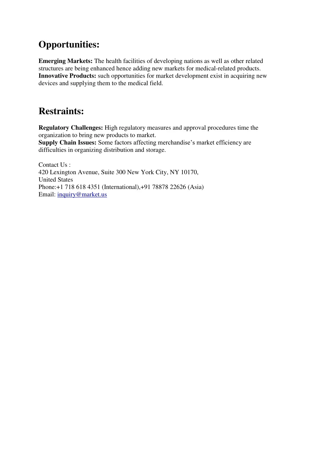 Opportunities: Emerging Markets: The health facilities of developing nations as well as other related structures are being enhanced hence adding new markets for medical-related products. Innovative Products: such opportunities for market development exist in acquiring new devices and supplying them to the medical field. Restraints: Regulatory Challenges: High regulatory measures and approval procedures time the organization to bring new products to market. Supply Chain Issues:Some factors affecting merchandise’s market efficiency are difficulties in organizing distribution and storage. Contact Us : 420 Lexington Avenue, Suite 300 New York City, NY 10170, United States Phone:+1 718 618 4351 (International),+91 78878 22626 (Asia) Email: inquiry@market.us