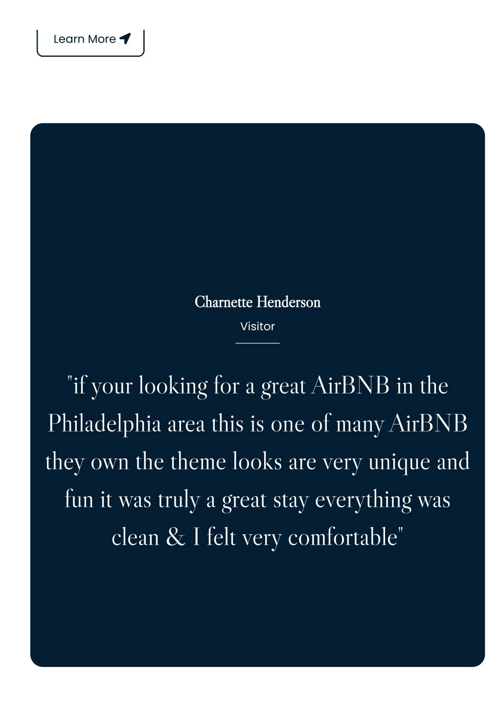 Learn More Charnette Henderson Visitor "if your looking for a great AirBNB in the Philadelphia area this is one of many AirBNB they own the theme looks are very unique and fun it was truly a great stay everything was clean & I felt very comfortable"