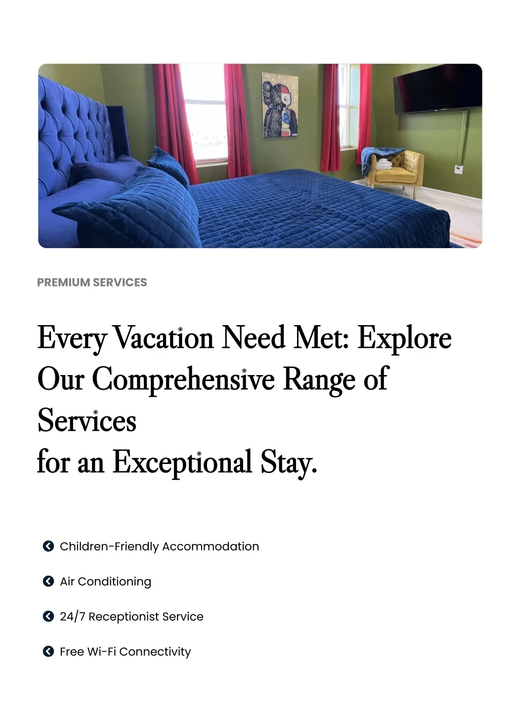 PREMIUM SERVICES Every Vacation Need Met: Explore Our Comprehensive Range of Services for an Exceptional Stay. Children-Friendly Accommodation Air Conditioning 24/7 Receptionist Service Free Wi-Fi Connectivity