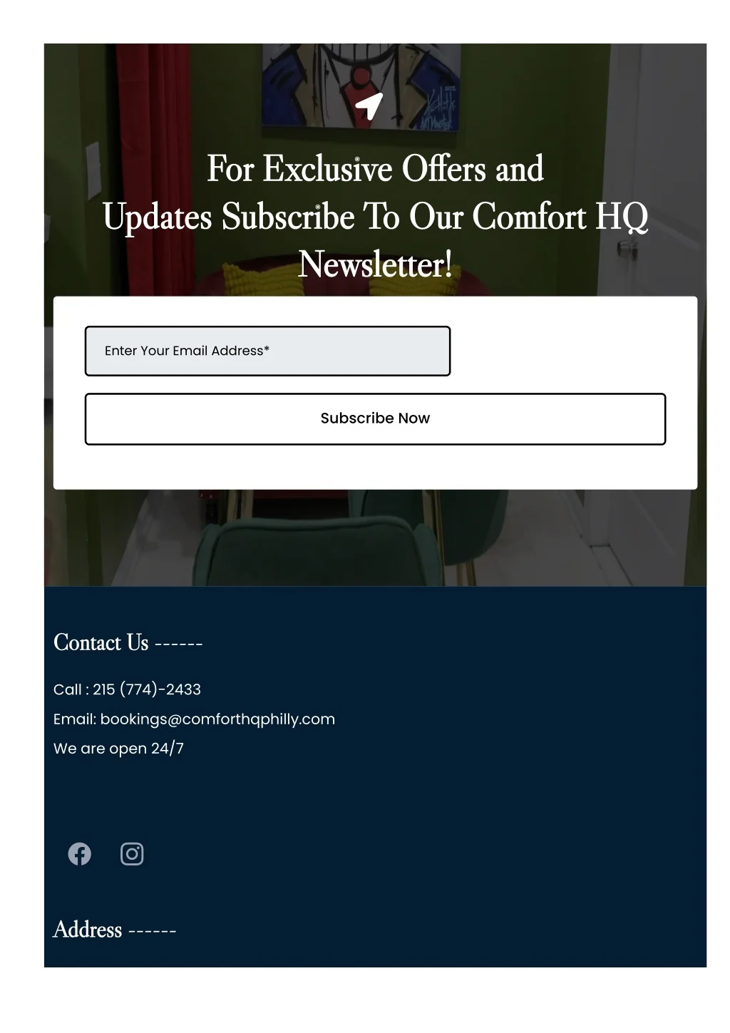 For Exclusive O?ers and Updates Subscribe To Our Comfort HQ Newsletter! Enter Your Email Address* Subscribe Now Contact Us ------ Call : 215 (774)-2433 Email: bookings@comforthqphilly.com We are open 24/7 Address ------