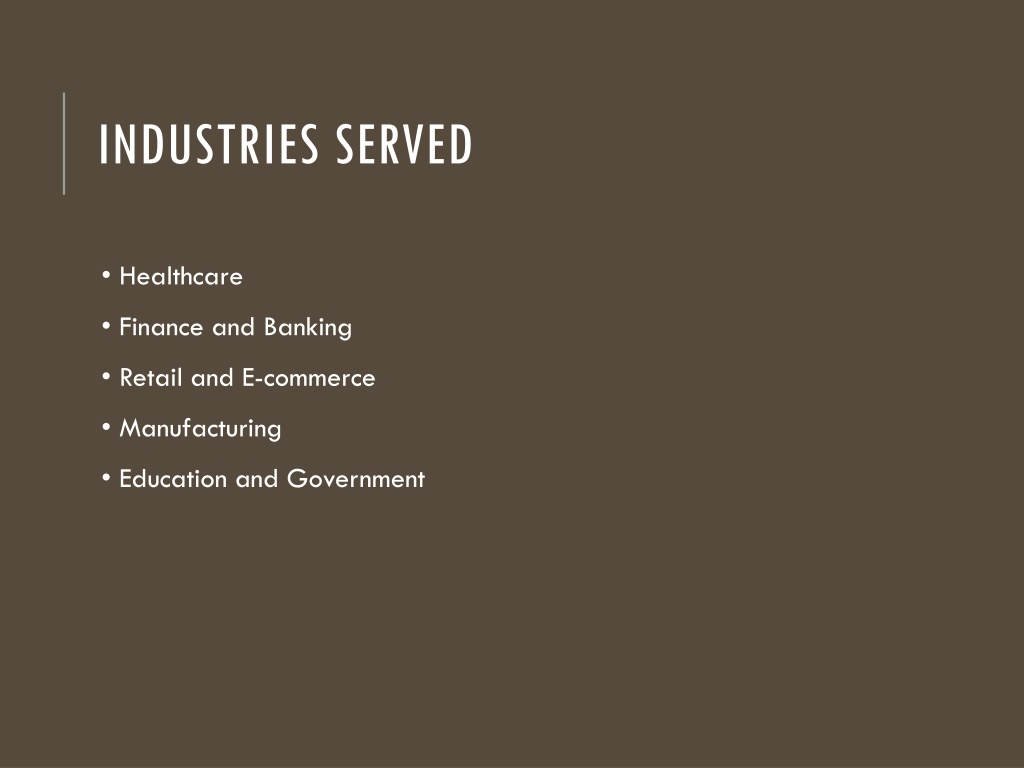 INDUSTRIES SERVED • Healthcare • Finance and Banking • Retail and E-commerce • Manufacturing • Education and Government