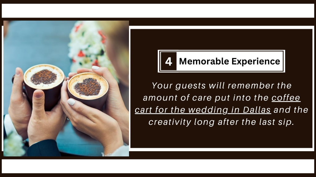 4 Memorable Experience Your guests will remember the amount of care put into the coffee cart for the wedding in Dallas and the creativity long after the last sip.