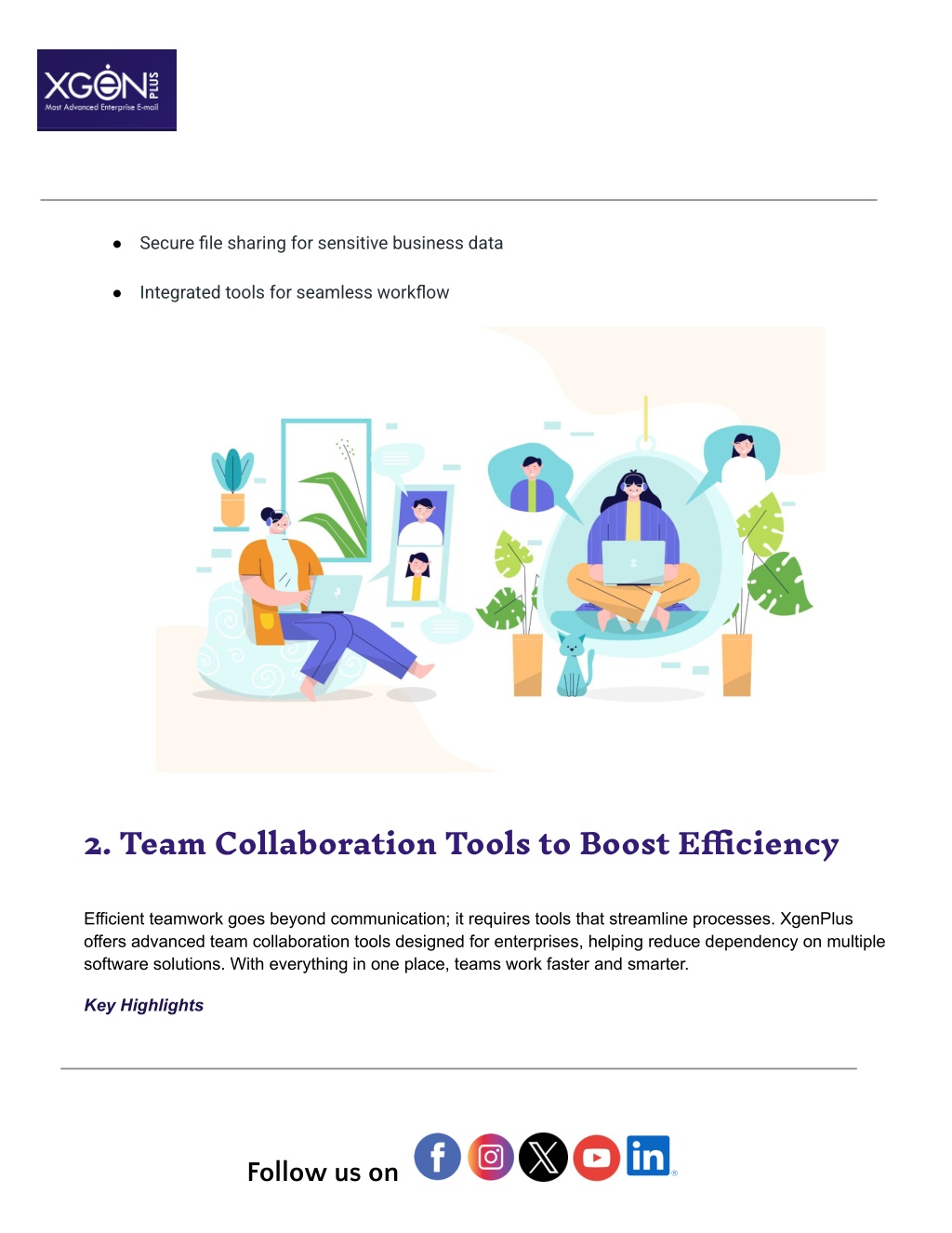 ● Secure file sharing for sensitive business data ● Integrated tools for seamless workflow 2. Team Collaboration Tools to Boost Efficiency Efficient teamwork goes beyond communication; it requires tools that streamline processes. XgenPlus offers advanced team collaboration tools designed for enterprises, helping reduce dependency on multiple software solutions. With everything in one place, teams work faster and smarter. Key Highlights Follow us on