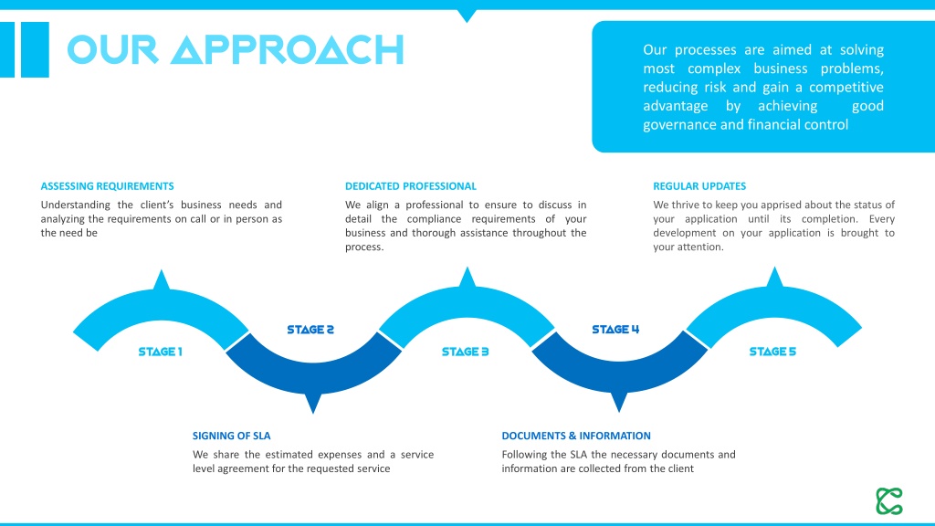 OUR APPROACH Our processes are aimed at solving most complex business problems, reducing risk and gain a competitive advantage by achieving governance and financial control good ASSESSING REQUIREMENTS DEDICATED PROFESSIONAL REGULAR UPDATES Understanding the client’s business needs and analyzing the requirements on call or in person as the need be We align a professional to ensure to discuss in detail the compliance requirements of your business and thorough assistance throughout the process. We thrive to keep you apprised about the status of your application until development on your application is brought to your attention. its completion. Every Stage 4 Stage 4 Stage 2 Stage 2 Stage 5 Stage 5 Stage 3 Stage 3 Stage 1 Stage 1 SIGNING OF SLA DOCUMENTS & INFORMATION We share the estimated expenses and a service level agreement for the requested service Following the SLA the necessary documents and information are collected from the client