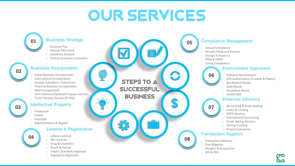 Our Services Business Strategy Compliance Management 01 05 o Business Plan o Startup Pitch Deck o Feasibility Analysis o Techno Economic Evaluation o Annual Compliance o Periodic Filing and Returns o Change in Business o FERA & FEMA o ListingCompliance Business Incorporation Environment Approvals 02 06 o Indian Business Incorporation o InternationalIncorporation o Foreign Subsidiary / India Entry o Financial Business Incorporation o NGO Incorporation o Joint Ventures/Speacial Purpose Vehicles o Trust/ Society/Section 8/ NGO o PollutionNoc/Consent o EPR Authorisation(E-waste & Plastic) o Bio MedicalWaste o Solid Waste o Hazardous Waste o CGWA NOC Financial Advisory Steps to a Steps to a Successful Successful Business Business Intellectual Property o Accounting & Book Keeping o Loans & Funding o VCFO Services o InternationalAccounting o Credit Rating Advisory o Startup Funding o ProjectEvaluation 07 03 o Trademark o Patent o Copyright o Representation& Appeal Licence & Registration Transaction Support o LabourLicences o RBI Licences o Drug & Cosmetics o Ayush & Herbal o Urban LocalBody Approval o Regulatory Approvals 04 08 o Transaction Advisory o Due Diligence o Mergers & Acquisition o IPO & FPO