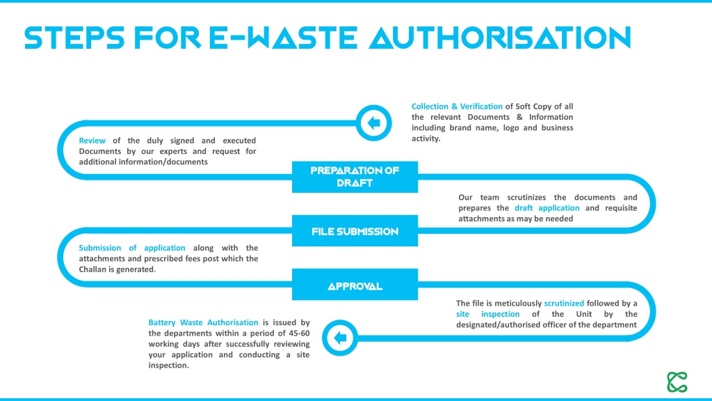 Steps for E-Waste Authorisation Collection & Verification of Soft Copy of all the relevant Documents & Information including brand name, logo and business activity. Review of the duly signed and executed Documents by our experts and request for additional information/documents Prep aration of Prep aration of draft draft Our team scrutinizes prepares the draft application and requisite attachmentsas may be needed the documents and FILE SUBMISSION FILE SUBMISSION Submission of application along with the attachments and prescribed fees post which the Challan is generated. APPROV AL APPROV AL The file is meticulously scrutinized followed by a site inspection of designated/authorised officer of the department the Unit by the Battery Waste Authorisation is issued by the departments within a period of 45-60 working days after successfully reviewing your application and conducting a site inspection.