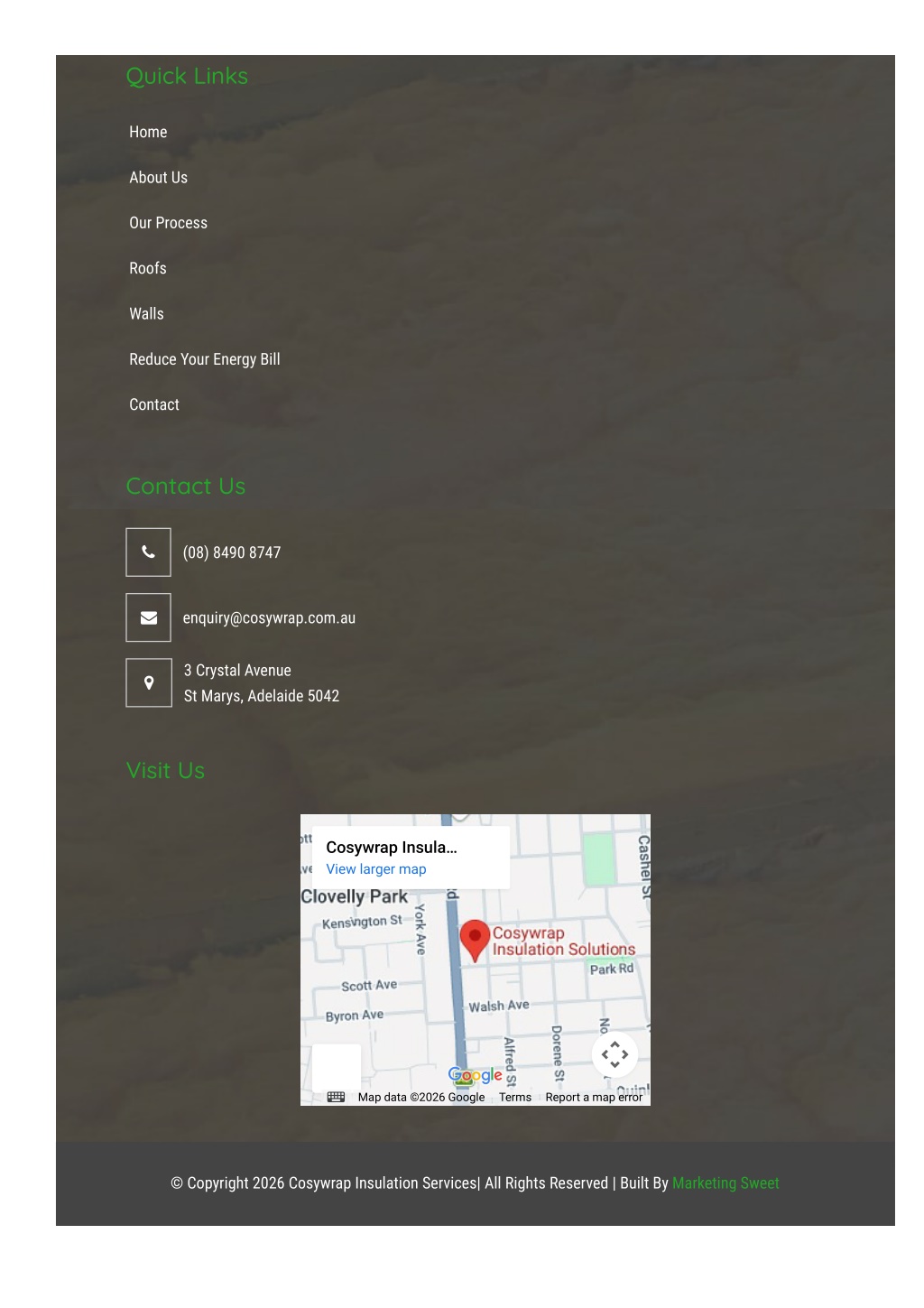 Quick Links Home About Us Our Process Roofs Walls Reduce Your Energy Bill Contact Contact Us (08) 8490 8747 enquiry@cosywrap.com.au 3 Crystal Avenue St Marys, Adelaide 5042 Visit Us Cosywrap Insula… View larger map Map data ©2026 Google Terms Report a map error © Copyright 2026 Cosywrap Insulation Services| All Rights Reserved | Built By Marketing Sweet