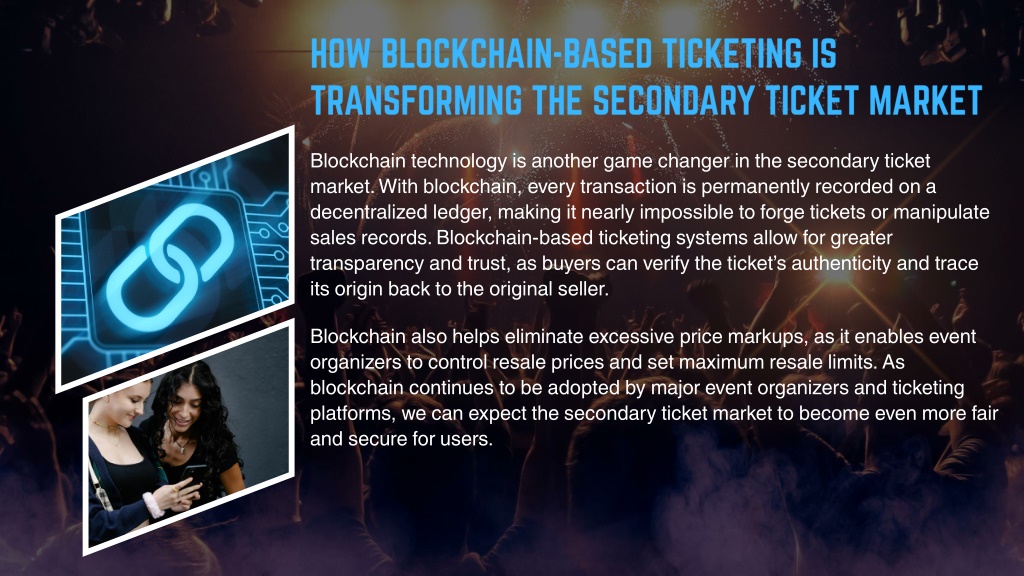 6. HOW BLOCKCHAIN-BASED TICKETING IS TRANSFORMING THE SECONDARY TICKET MARKET Blockchain technology is another game changer in the secondary ticket market. With blockchain, every transaction is permanently recorded on a decentralized ledger, making it nearly impossible to forge tickets or manipulate sales records. Blockchain-based ticketing systems allow for greater transparency and trust, as buyers can verify the ticket’s authenticity and trace its origin back to the original seller. Blockchain also helps eliminate excessive price markups, as it enables event organizers to control resale prices and set maximum resale limits. As blockchain continues to be adopted by major event organizers and ticketing platforms, we can expect the secondary ticket market to become even more fair and secure for users.