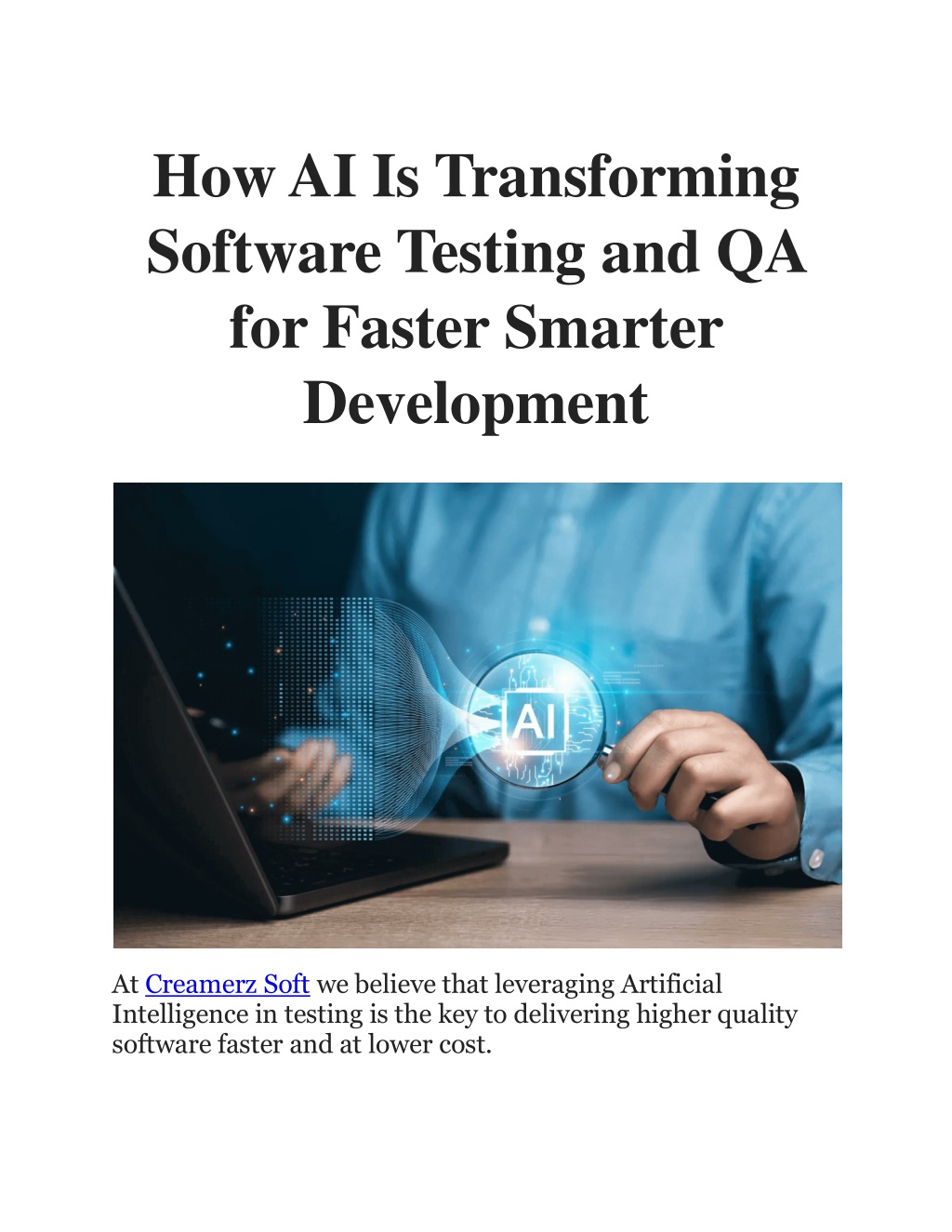 How AI Is Transforming Software Testing and QA for Faster Smarter Development At Creamerz Soft we believe that leveraging Artificial Intelligence in testing is the key to delivering higher quality software faster and at lower cost.