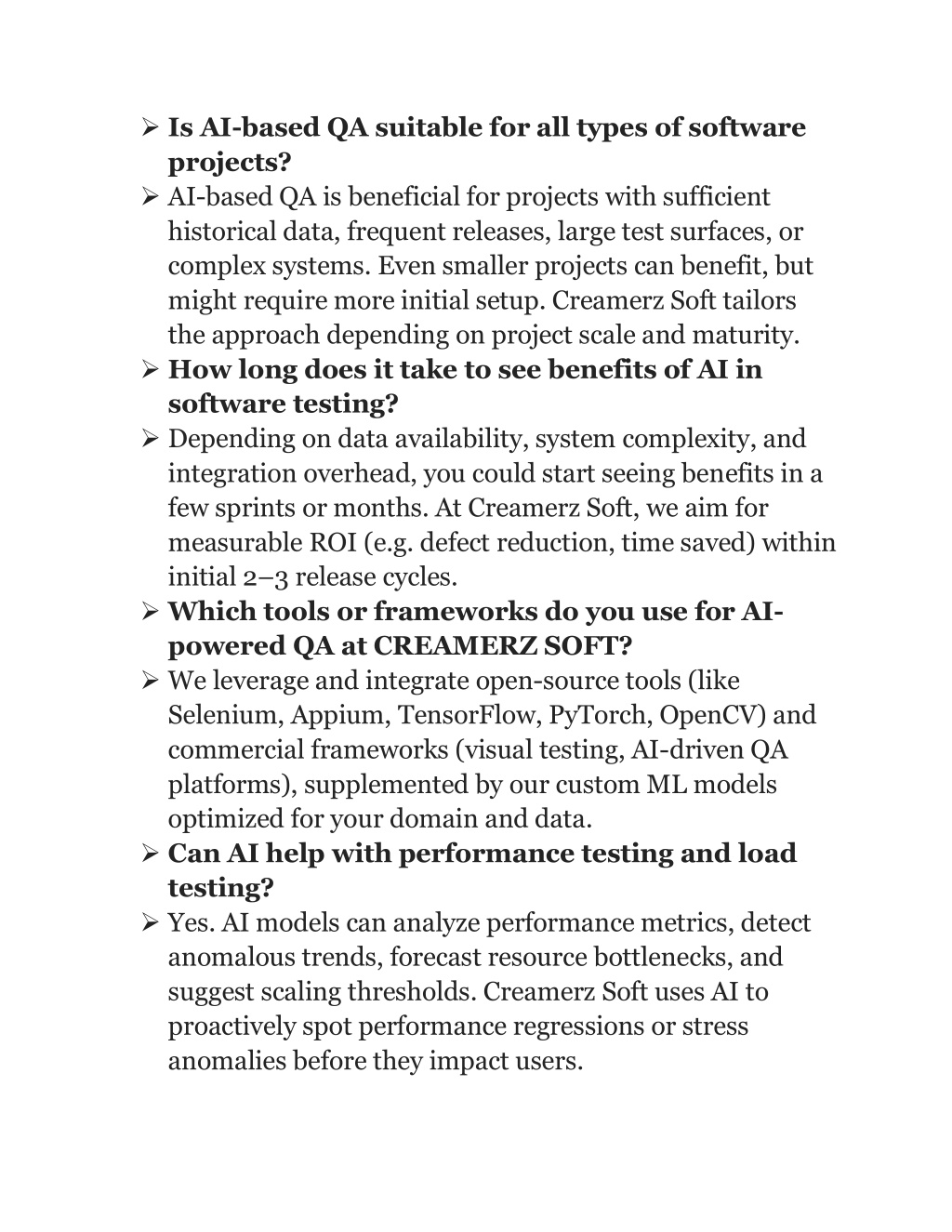 (e.g. performance drift, latency spikes, unexpected errors), and feed these insights back into testing cycles. This creates a feedback loop: production data helps refine test scenarios. Creamerz Soft leverages this approach to close the gap between development, QA, and operations. Real-World Benefits & Outcomes Faster Time-to-Market & Shorter Release Cycles AI-driven automation and prioritization reduce test cycle durations. Organizations can ship updates more rapidly with confidence. Higher Defect Detection Rate & Fewer Escapes Prioritizing high-risk test areas and leveraging anomaly detection ensures more defects are caught earlier. Reduced Test Maintenance Cost Self-healing scripts, optimized test suites, and AI-driven refactoring reduce manual overhead and test flakiness. Smarter Resource Allocation QA teams focus on complex exploratory testing while AI handles repetitive and voluminous test tasks. Better Test Coverage & Risk Mitigation AI helps identify gaps in testing by analyzing usage patterns and code changes, resulting in more comprehensive coverage.