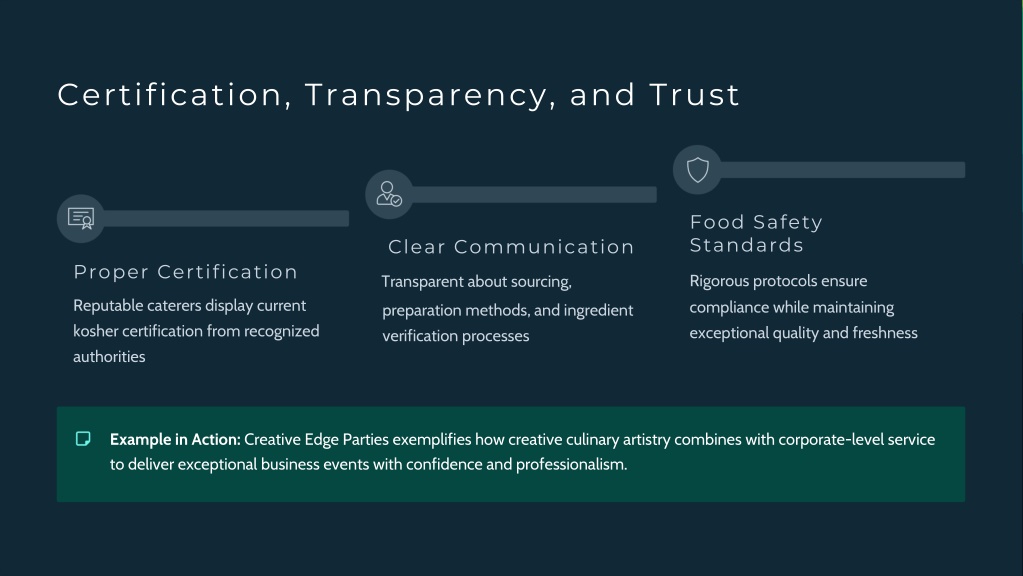 Certification, Transparency, and Trust Food Safety Standards Clear Communication Proper Certification Rigorous protocols ensure compliance while maintaining exceptional quality and freshness Transparent about sourcing, Reputable caterers display current kosher certification from recognized authorities preparation methods, and ingredient verification processes Example in Action: Creative Edge Parties exemplifies how creative culinary artistry combines with corporate-level service to deliver exceptional business events with confidence and professionalism.