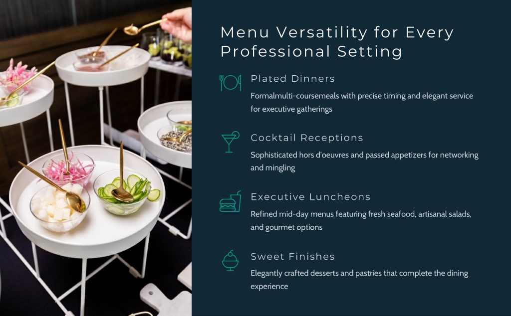 Menu Versatility for Every Professional Setting PlatedDinners Formalmulti-coursemeals with precise timing and elegant service for executive gatherings Cocktail Receptions Sophisticated hors d'oeuvres and passed appetizers for networking and mingling Executive Luncheons Refined mid-day menus featuring fresh seafood, artisanal salads, and gourmet options Sweet Finishes Elegantly crafted desserts and pastries that complete the dining experience