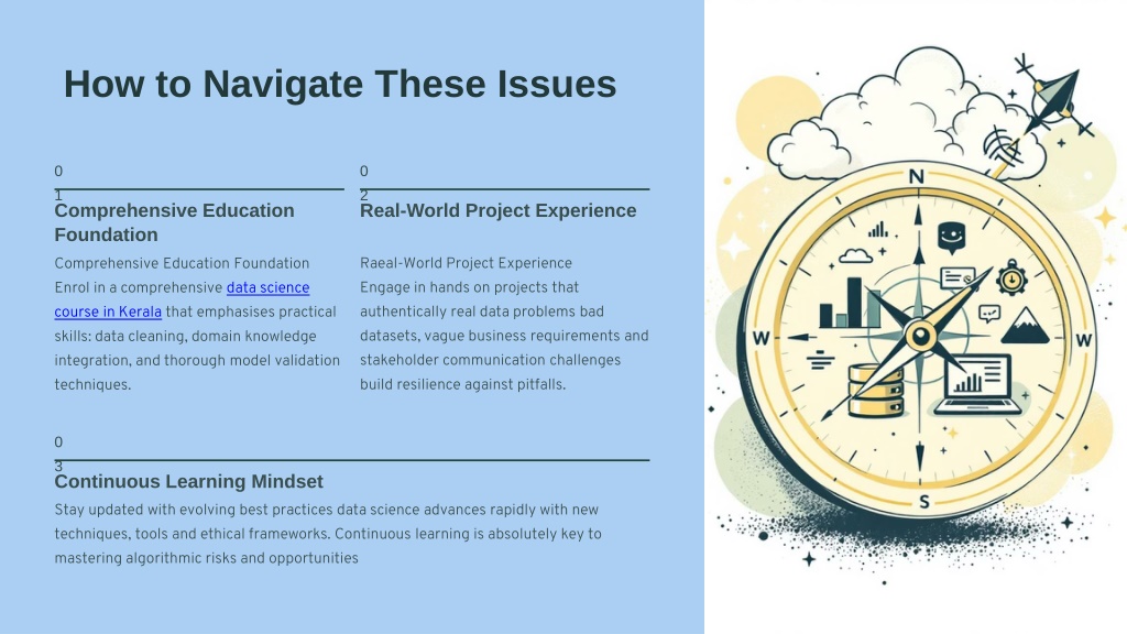 How to Navigate These Issues 01 02 Comprehensive Education Foundation Real-World Project Experience Raeal-World Project Experience Engage in hands on projects that authentically real data problems bad datasets, vague business requirements and stakeholder communication challenges build resilience against pitfalls. Comprehensive Education Foundation Enrol in a comprehensive data science course in Kerala that emphasises practical skills: data cleaning, domain knowledge integration, and thorough model validation techniques. 03 Continuous Learning Mindset Stay updated with evolving best practices data science advances rapidly with new techniques, tools and ethical frameworks. Continuous learning is absolutely key to mastering algorithmic risks and opportunities