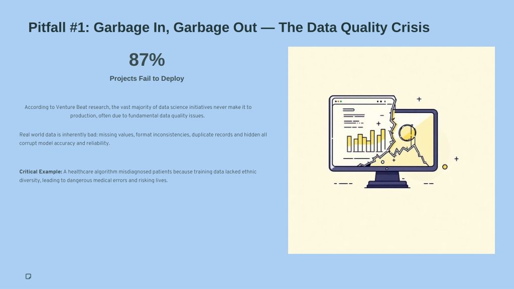 Pitfall #1: Garbage In, Garbage Out — The Data Quality Crisis 87% Projects Fail to Deploy According to Venture Beat research, the vast majority of data science initiatives never make it to production, often due to fundamental data quality issues. Real world data is inherently bad: missing values, format inconsistencies, duplicate records and hidden all corrupt model accuracy and reliability. Critical Example: A healthcare algorithm misdiagnosed patients because training data lacked ethnic diversity, leading to dangerous medical errors and risking lives.