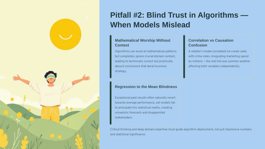 Pitfall #2: Blind Trust in Algorithms — When Models Mislead Mathematical Worship Without Context Correlation vs Causation Confusion Algorithms can excel at mathematical patterns but completely ignore crucial domain context, leading to technically correct but practically absurd conclusions that derail business strategy. A retailer's model correlated ice cream sales with crime rates, misguiding marketing spend by millions — the real link was summer weather affecting both variables independently. Regression to the Mean Blindness Exceptional past results often naturally revert towards average performance, yet models fail to anticipate this statistical reality, creating unrealistic forecasts and disappointed stakeholders. Critical thinking and deep domain expertise must guide algorithm deployment, not just impressive numbers and statistical significance.