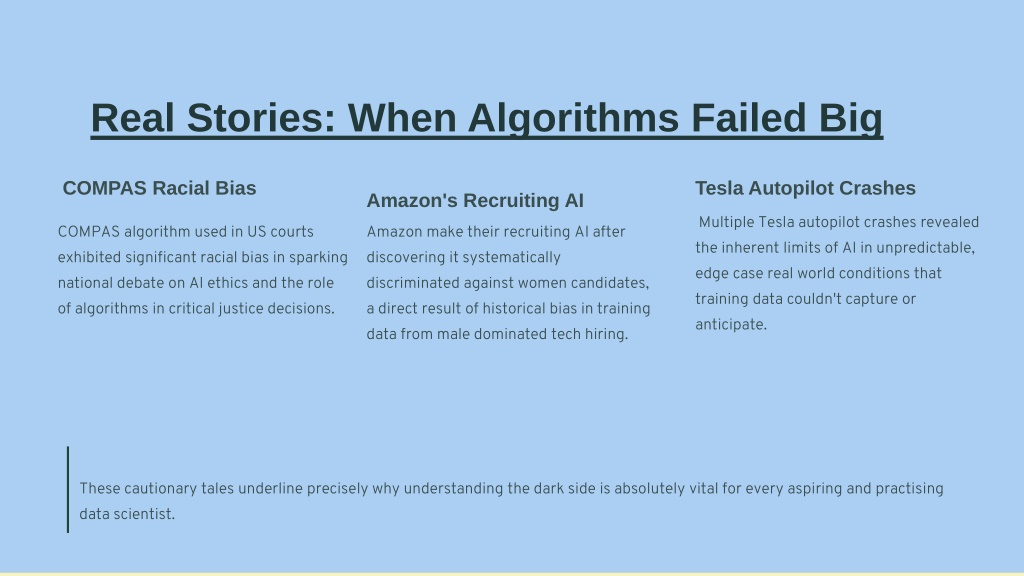 Real Stories: When Algorithms Failed Big COMPAS Racial Bias Tesla Autopilot Crashes Amazon's Recruiting AI Multiple Tesla autopilot crashes revealed the inherent limits of AI in unpredictable, edge case real world conditions that training data couldn't capture or anticipate. COMPAS algorithm used in US courts exhibited significant racial bias in sparking national debate on AI ethics and the role of algorithms in critical justice decisions. Amazon make their recruiting AI after discovering it systematically discriminated against women candidates, a direct result of historical bias in training data from male dominated tech hiring. These cautionary tales underline precisely why understanding the dark side is absolutely vital for every aspiring and practising data scientist.
