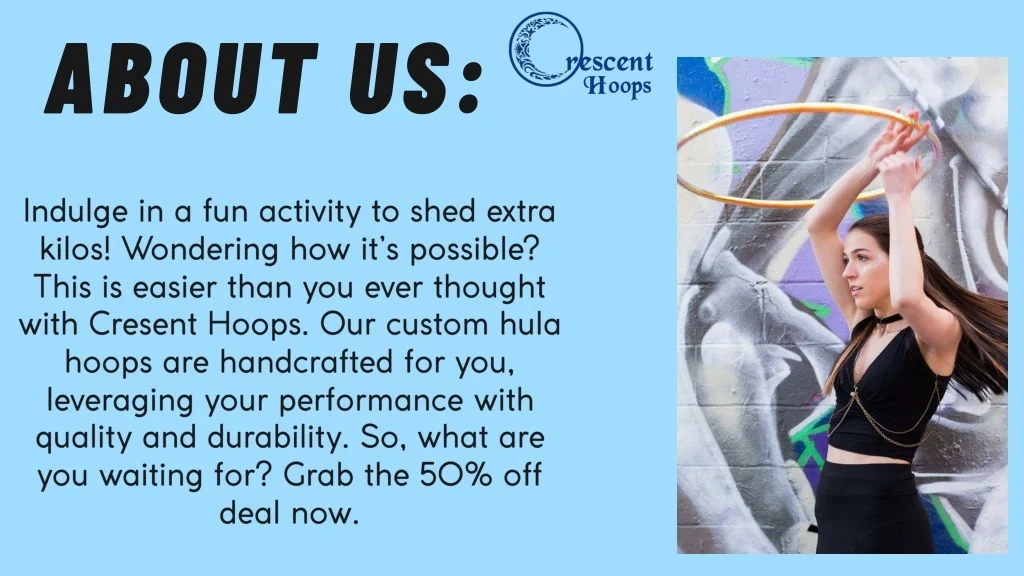 ABOUT US: Indulge in a fun activity to shed extra kilos! Wondering how it’s possible? This is easier than you ever thought with Cresent Hoops. Our custom hula hoops are handcrafted for you, leveraging your performance with quality and durability. So, what are you waiting for? Grab the 50% off deal now.