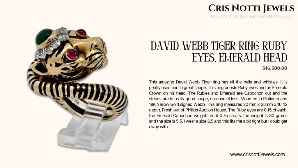 David Webb Tiger ring Ruby eyes, Emerald Head $16,500.00 This amazing David Webb Tiger ring has all the bells and whistles. It is gently used and in great shape. This ring boosts Ruby eyes and an Emerald Crown on his head. The Rubies and Emerald are Cabochon cut and the stripes are in really good shape, no enamel loss. Mounted in Platinum and 18K Yellow Gold signed Webb. This ring measures 20 mm x 28mm x 16.42 depth. Fresh out of Phillips Auction House. The Ruby eyes are 0.15 ct each, the Emerald Cabochon weights in at 0.75 carats, the weight is 30 grams and the size is 5.5. I wear a size 6.5 and this fits me a bit tight but I could get away with it. www.crisnottijewels.com