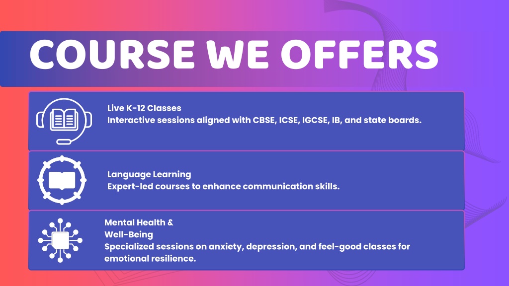 OFFERS COURSE WE Live K-12 Classes Interactive sessions aligned with CBSE, ICSE, IGCSE, IB, and state boards. Language Learning Expert-led courses to enhance communication skills. Mental Health & Well-Being Specialized sessions on anxiety, depression, and feel-good classes for emotional resilience.