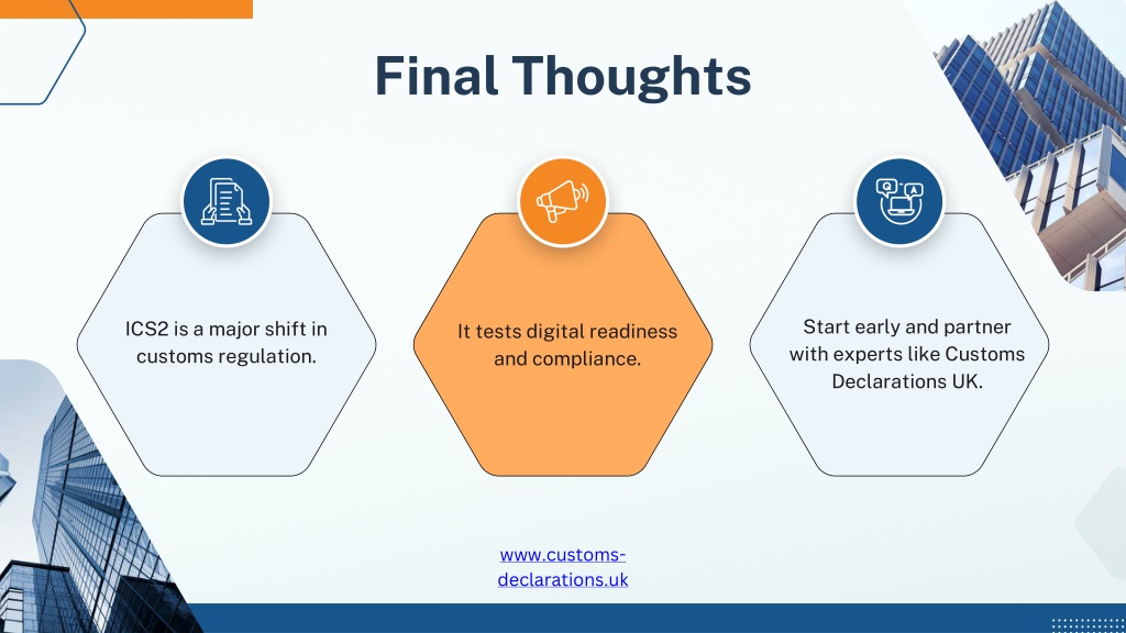 Final Thoughts Start early and partner with experts like Customs Declarations UK. ICS2 is a major shift in customs regulation. It tests digital readiness and compliance. www.customs-declarations.uk