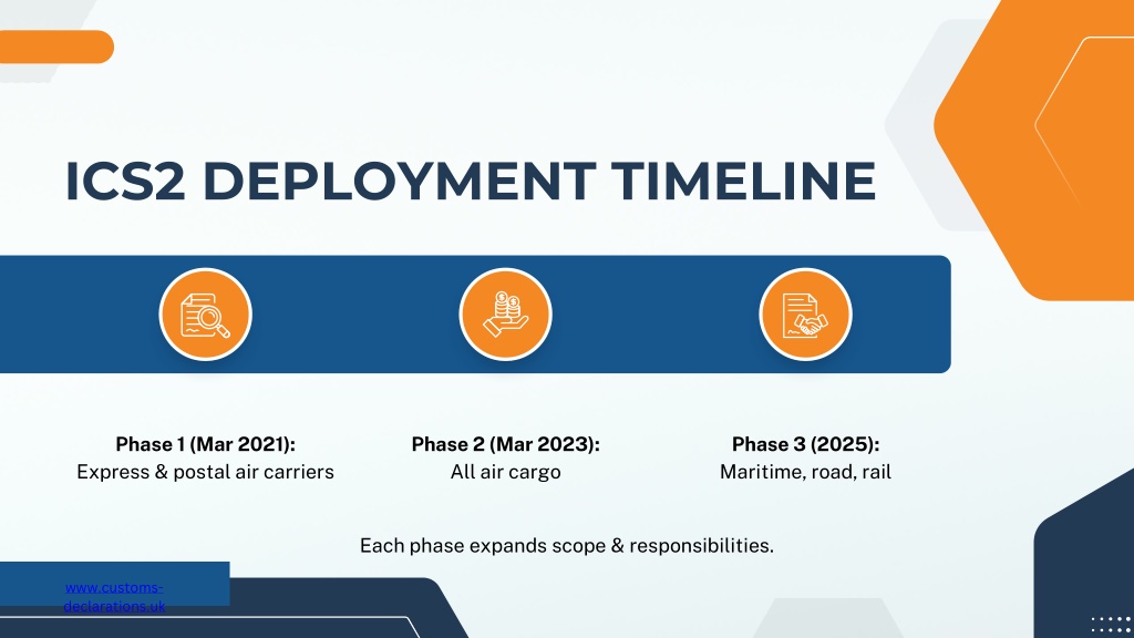 ICS2 DEPLOYMENT TIMELINE Phase 1 (Mar 2021): Express & postal air carriers Phase 2 (Mar 2023): All air cargo Phase 3 (2025): Maritime, road, rail Each phase expands scope & responsibilities. www.customs-declarations.uk