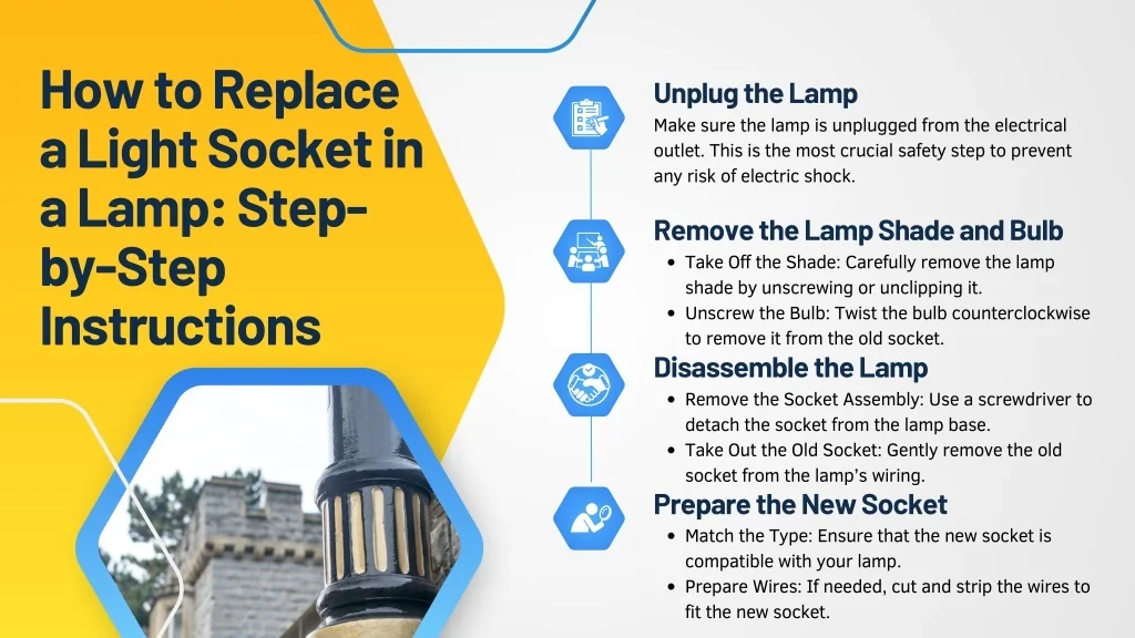 How to Replace a Light Socket in a Lamp: Step- by-Step Instructions Unplug the Lamp Make sure the lamp is unplugged from the electrical outlet. This is the most crucial safety step to prevent any risk of electric shock. Remove the Lamp Shade and Bulb Take Off the Shade: Carefully remove the lamp shade by unscrewing or unclipping it. Unscrew the Bulb: Twist the bulb counterclockwise to remove it from the old socket. Disassemble the Lamp Remove the Socket Assembly: Use a screwdriver to detach the socket from the lamp base. Take Out the Old Socket: Gently remove the old socket from the lamp’s wiring. Prepare the New Socket Match the Type: Ensure that the new socket is compatible with your lamp. Prepare Wires: If needed, cut and strip the wires to fit the new socket.