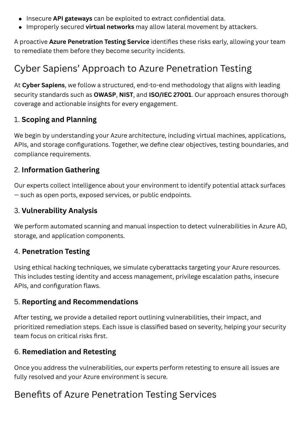 3. Insecure API gateways can be exploited to extract confidential data. Improperly secured virtual networks may allow lateral movement by attackers. A proactive Azure Penetration Testing Service identifies these risks early, allowing your team to remediate them before they become security incidents. Cyber Sapiens’ Approach to Azure Penetration Testing At Cyber Sapiens, we follow a structured, end-to-end methodology that aligns with leading security standards such as OWASP, NIST, and ISO/IEC 27001. Our approach ensures thorough coverage and actionable insights for every engagement. 1. Scoping and Planning We begin by understanding your Azure architecture, including virtual machines, applications, APIs, and storage configurations. Together, we define clear objectives, testing boundaries, and compliance requirements. 2. Information Gathering Our experts collect intelligence about your environment to identify potential attack surfaces — such as open ports, exposed services, or public endpoints. 3. Vulnerability Analysis We perform automated scanning and manual inspection to detect vulnerabilities in Azure AD, storage, and application components. 4. Penetration Testing Using ethical hacking techniques, we simulate cyberattacks targeting your Azure resources. This includes testing identity and access management, privilege escalation paths, insecure APIs, and configuration flaws. 5. Reporting and Recommendations After testing, we provide a detailed report outlining vulnerabilities, their impact, and prioritized remediation steps. Each issue is classified based on severity, helping your security team focus on critical risks first. 6. Remediation and Retesting Once you address the vulnerabilities, our experts perform retesting to ensure all issues are fully resolved and your Azure environment is secure. Benefits of Azure Penetration Testing Services