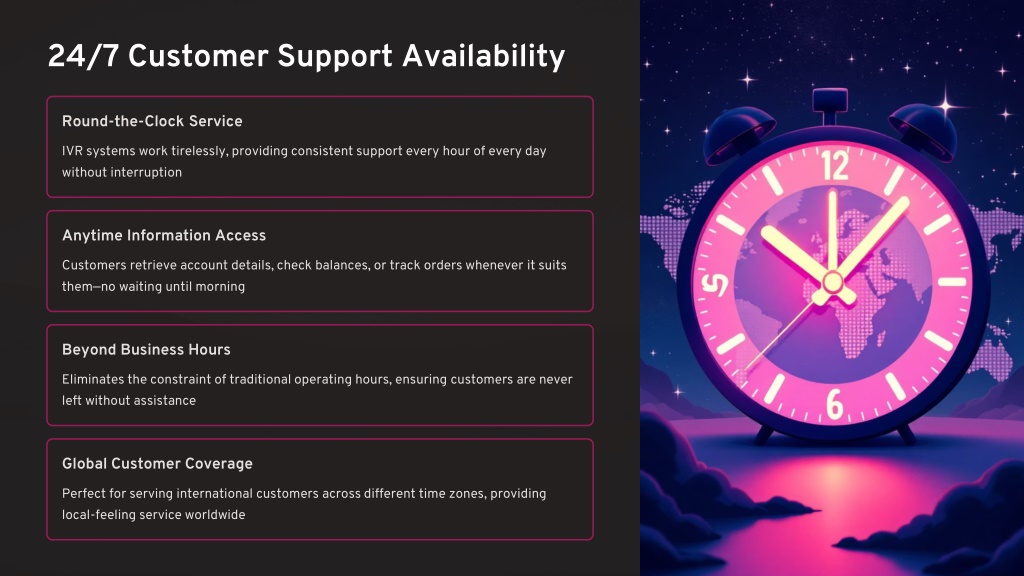 24/7 Customer Support Availability Round-the-Clock Service IVR systems work tirelessly, providing consistent support every hour of every day without interruption Anytime Information Access Customers retrieve account details, check balances, or track orders whenever it suits them—no waiting until morning Beyond Business Hours Eliminates the constraint of traditional operating hours, ensuring customers are never left without assistance Global Customer Coverage Perfect for serving international customers across different time zones, providing local-feeling service worldwide
