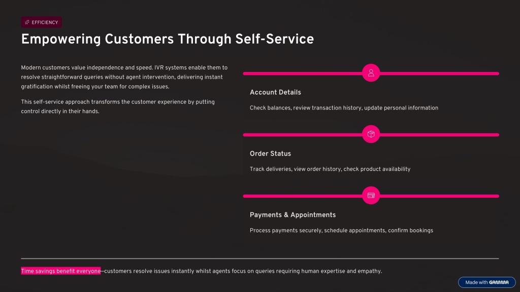 EFFICIENCY Empowering Customers Through Self-Service Modern customers value independence and speed. IVR systems enable them to resolve straightforward queries without agent intervention, delivering instant gratification whilst freeing your team for complex issues. Account Details This self-service approach transforms the customer experience by putting control directly in their hands. Check balances, review transaction history, update personal information Order Status Track deliveries, view order history, check product availability Payments & Appointments Process payments securely, schedule appointments, confirm bookings Time savings benefit everyone—customers resolve issues instantly whilst agents focus on queries requiring human expertise and empathy.
