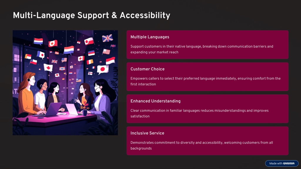 Multi-Language Support & Accessibility Multiple Languages Support customers in their native language, breaking down communication barriers and expanding your market reach Customer Choice Empowers callers to select their preferred language immediately, ensuring comfort from the first interaction Enhanced Understanding Clear communication in familiar languages reduces misunderstandings and improves satisfaction Inclusive Service Demonstrates commitment to diversity and accessibility, welcoming customers from all backgrounds