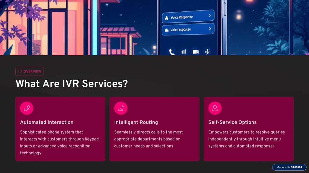 OVERVIEW What Are IVR Services? Automated Interaction Intelligent Routing Self-Service Options Sophisticated phone system that interacts with customers through keypad inputs or advanced voice recognition technology Seamlessly directs calls to the most appropriate departments based on customer needs and selections Empowers customers to resolve queries independently through intuitive menu systems and automated responses