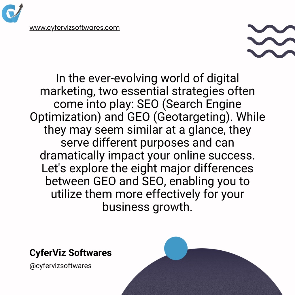 www.cyfervizsoftwares.com In the ever-evolving world of digital marketing, two essential strategies often come into play: SEO (Search Engine Optimization) and GEO (Geotargeting). While they may seem similar at a glance, they serve different purposes and can dramatically impact your online success. Let's explore the eight major differences between GEO and SEO, enabling you to utilize them more effectively for your business growth. CyferViz Softwares @cyfervizsoftwares