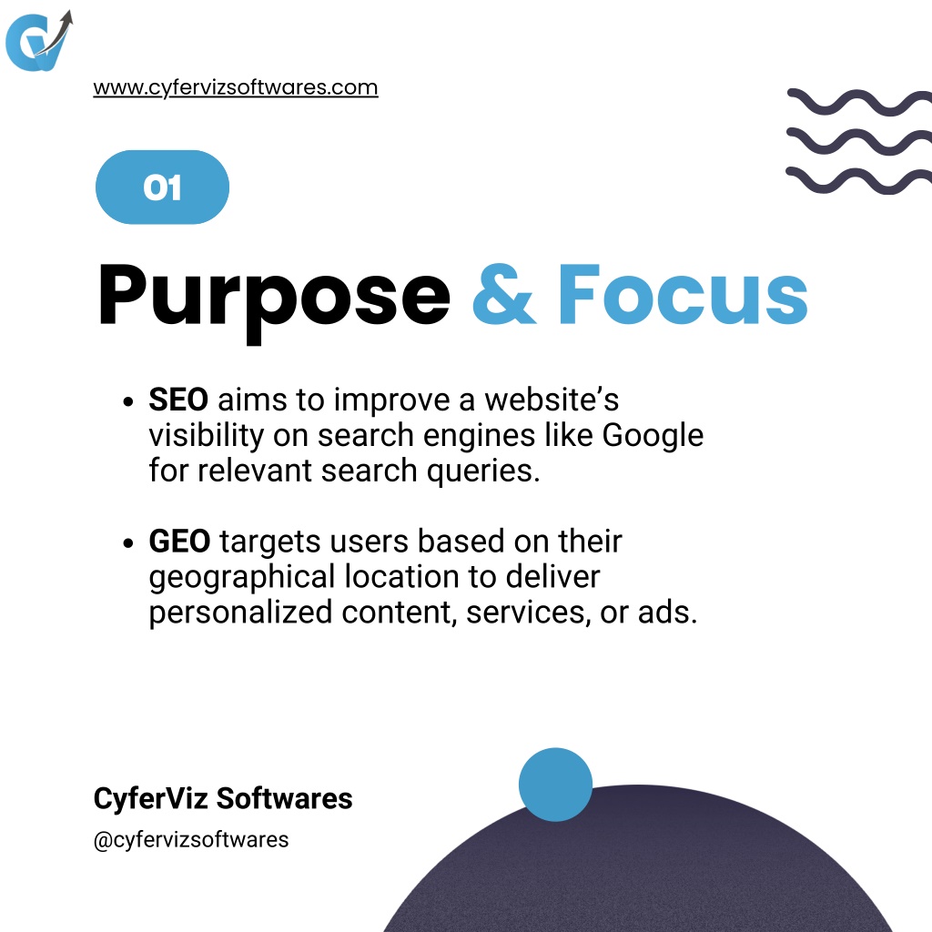 www.cyfervizsoftwares.com 01 Purpose & Focus SEO aims to improve a website’s visibility on search engines like Google for relevant search queries. GEO targets users based on their geographical location to deliver personalized content, services, or ads. CyferViz Softwares @cyfervizsoftwares