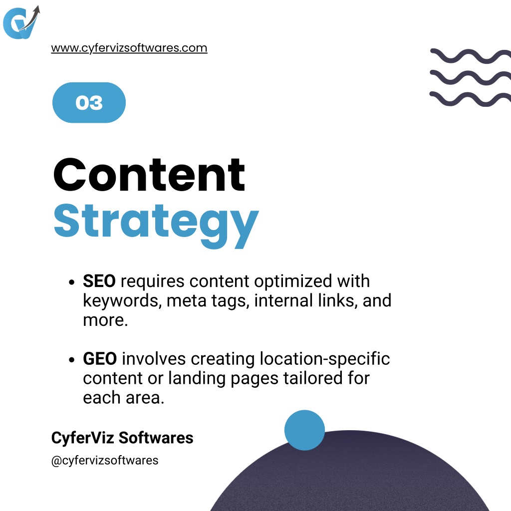www.cyfervizsoftwares.com 03 Content Strategy SEO requires content optimized with keywords, meta tags, internal links, and more. GEO involves creating location-specific content or landing pages tailored for each area. CyferViz Softwares @cyfervizsoftwares