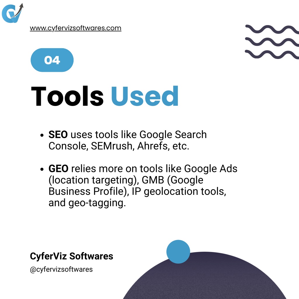 www.cyfervizsoftwares.com 04 Tools Used SEO uses tools like Google Search Console, SEMrush, Ahrefs, etc. GEO relies more on tools like Google Ads (location targeting), GMB (Google Business Profile), IP geolocation tools, and geo-tagging. CyferViz Softwares @cyfervizsoftwares